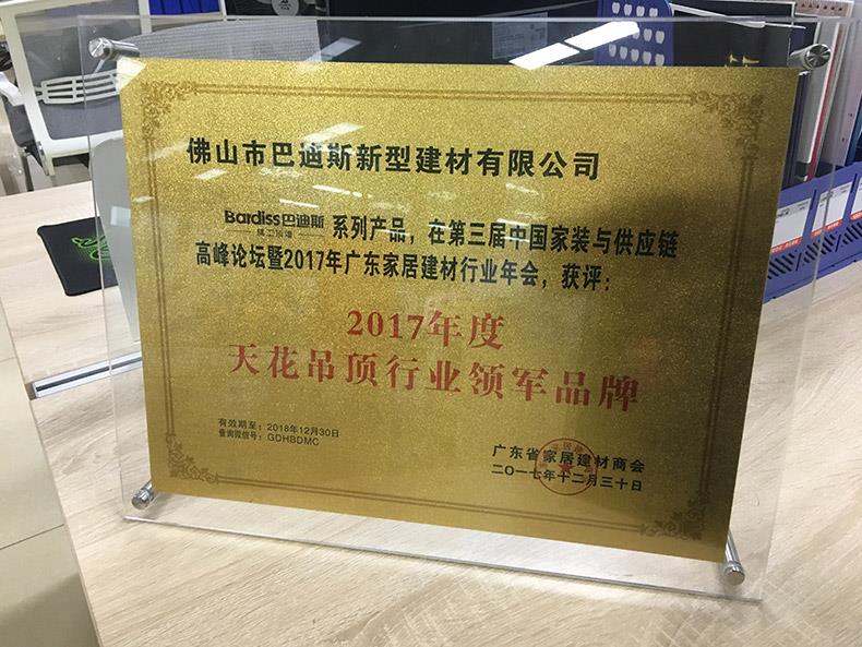 在最后的2017年度行業領軍品牌頒獎儀式中,巴迪斯榮獲2017年度天花吊頂行業領軍品牌大獎,這是中國建材家居行業又一次對巴迪斯精工頂墻大品牌的認可!