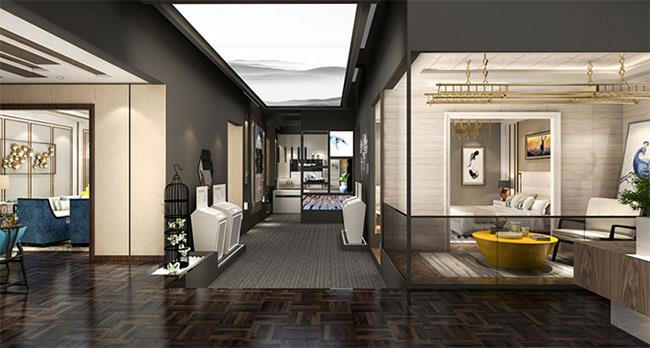展館大面積使用玻璃隔斷,加之頂部空間及墻面上陳列著的匠心獨具的精工頂墻產品,增加了空間的通透感,凸顯出空間高雅時尚的效果。