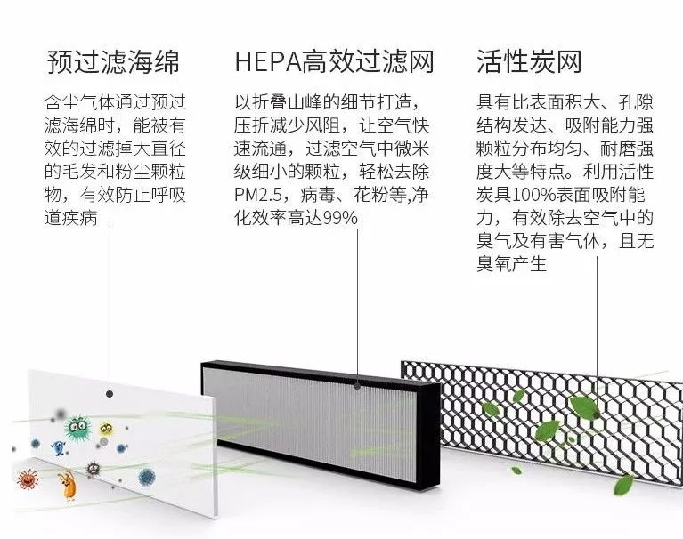 集預(yù)過(guò)濾海綿、HEPA高效過(guò)濾網(wǎng)、活性炭三層濾網(wǎng),將空氣中大到灰塵細(xì)屑、小到分子級(jí)別的甲醛、毒害物質(zhì)隔除在外,為您的生活帶來(lái)源源不斷的潔凈體驗(yàn),實(shí)驗(yàn)證明,三重過(guò)濾,絕對(duì)安全可靠,見(jiàn)下圖: