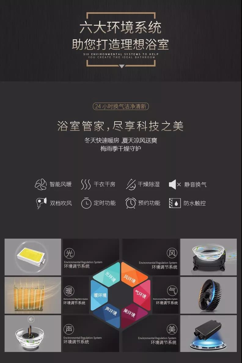 六大環(huán)境系統(tǒng)隨意調(diào)節(jié),輕松應(yīng)對(duì)各種環(huán)境下的浴室問題,人性化的功能設(shè)置保障用戶的在浴室中的良好體驗(yàn)。